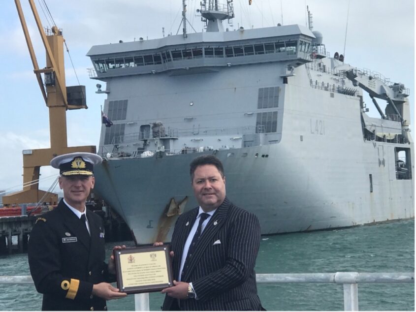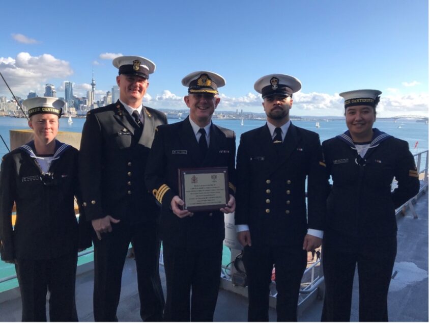 When originally presented there was what turned out to be a false positive COVID case on the ship, so the plaque was presented to the Maritime Component Commander CDRE Mathew Williams MNZM (now Vice Chief of Defence Force RADM Mathew Williams MNZM) on land, pictured below.